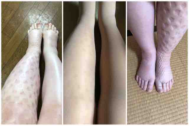 2020年09月25日 夜間モビダーム足裏加工 今日も平編み履きました。ちょっと涼しくなったせいか?楽です。ぱんぱんだった脚も峠は越えたのか若干引いてきた気配も感じます。LVAのおかげでずぼらしてもそんなひどくならなかったけど、サボりすぎると戻り方も緩やかです。ここで頑張らないとこのまま固まりそう。そんな折に新しい夜間モビダームの足裏に自分で改良してモビダームの切れ端を縫い付けたよというのを聞きました。元々、ドイツでは足裏にぶつぶつは付いてないのをののクールでは日本仕様で付けてくれてたらしい。これからはその加工は無くなったとの事。絶対ある方がいいのに。切れ端をを縫いつけようとしたけど針を通すと糊がくっついて通りにくい。パッチワークのキルト針では折れそう。とりあえず要所要所を縫って今日は履いてみます。カットするのももったい無いのでちょっとつま先からのぞきます。折り返したらグッドです。できは、あんまりで、ドイツの職人さんに仕あげて欲しい気持ちはありますが、とりあえずちまちまと日本人は改良しますネ。ストレッチやソケイ部周辺とかのマッサージもして効果があったというのでさっきTVを見ながらやったら、そのままうたた寝してました。身体がかたいので、びっくりしたのかも。ちょっとセルフケアのモチベーションが、上がっております。右脚まで腫れてたのはヒキははやい。一日中履いてると平編みアトご飯くっきり。