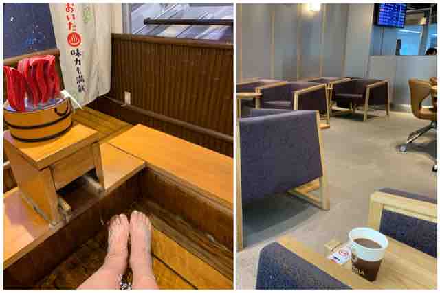 でも到着時に見つけた空港内の足湯に使ったりラウンジでゆっくりしました。